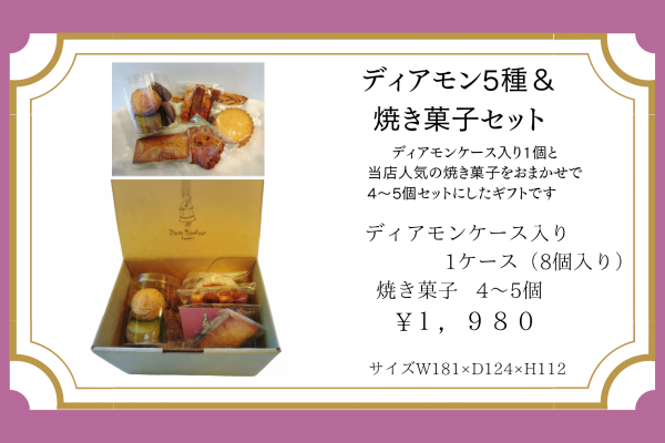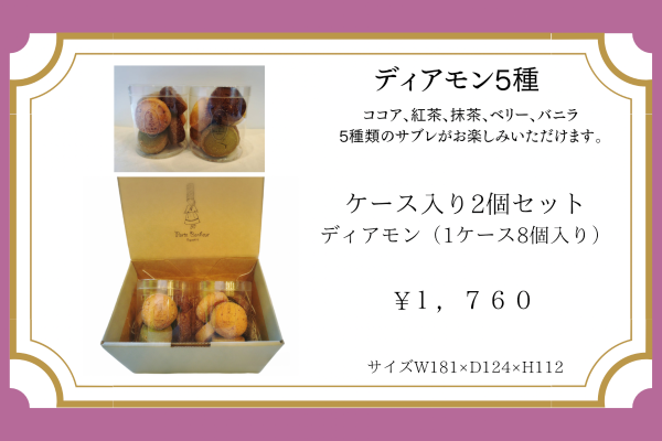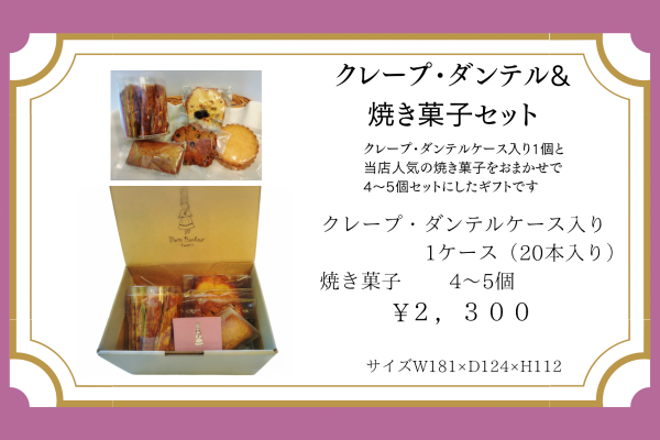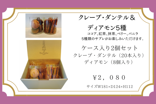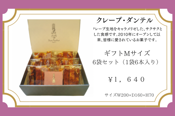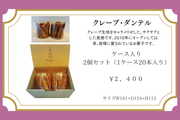 HOME | オンラインショップ Online Shop オンラインショップ 焼き菓子ギフト、冷凍ケーキを販売しております。受注生産となりますので、ご予定がお決まりになりましたら、お早めにご注文くださいませ。 クレープダンテル クレープ生地をキャラメリゼした、サクサクとした食感。2010年にオープンして以来、永く愛されているお菓子です。 ダンテル ディアモン&ダンテル ディアモン ダンテル&焼菓子 ディアモン&焼菓子 ご注文はこちら