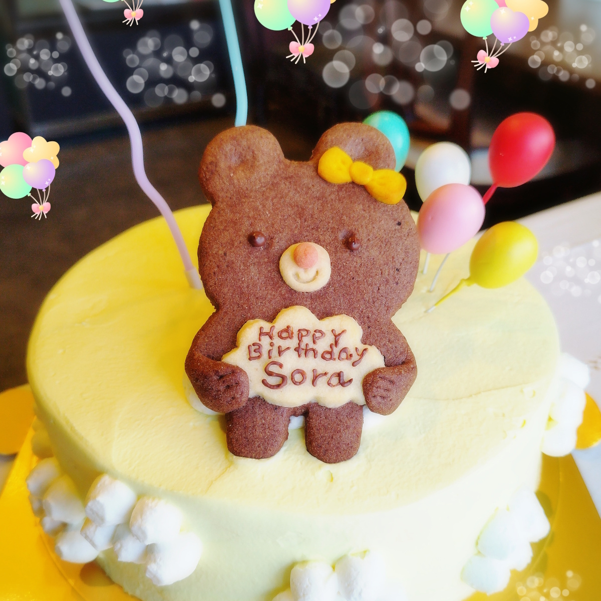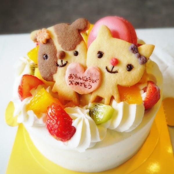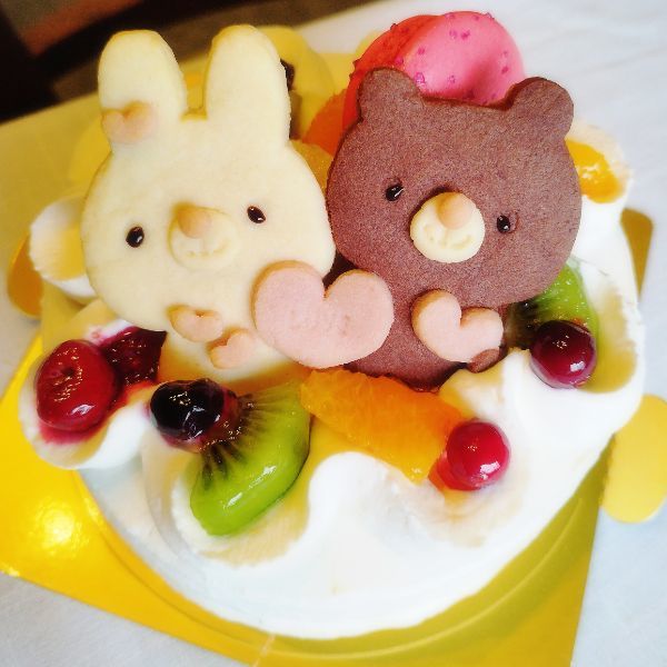 可愛いうさぎ&くまのクッキーとマカロンがのったケーキです。