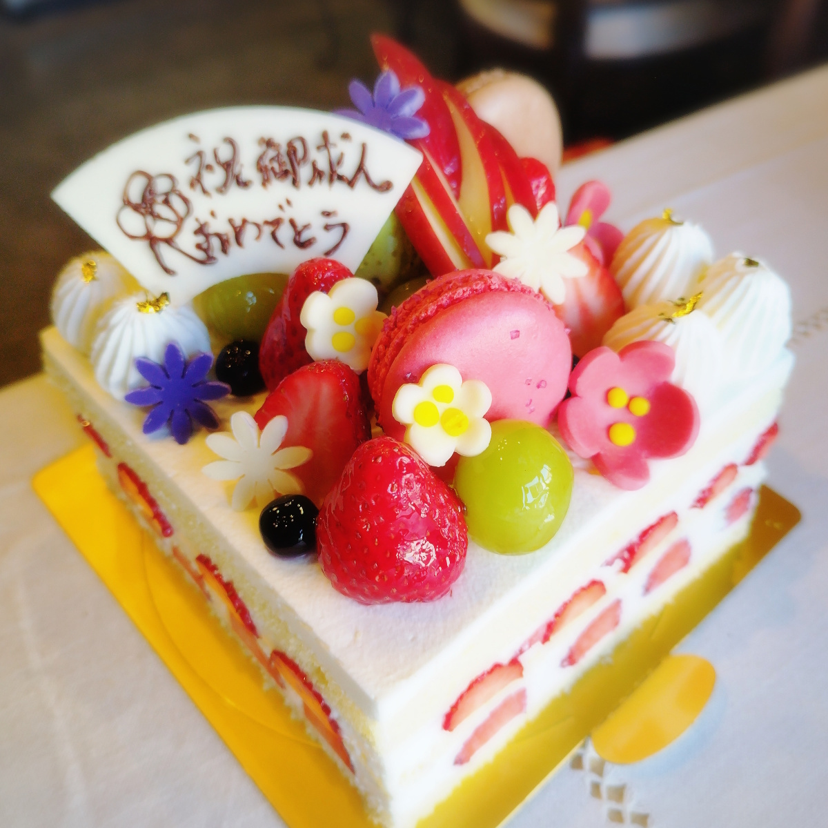 スクエアカットのショートケーキに3種のマカロン、華やかな飾り付けを散りばめました。合格祝い、卒業祝い、入学祝いなど、華やかなケーキでお祝いにふさわしいケーキです。